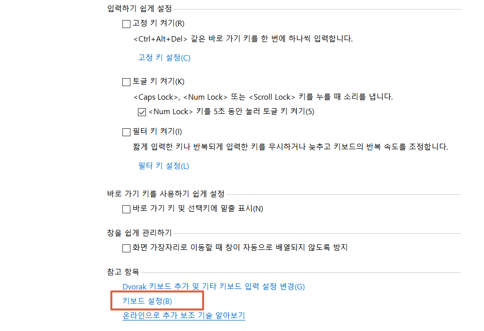 접근성 센터 창이 뜨면 위의 사진처럼 '키보드를 사용하기 쉽게 설정' 메뉴를 선택합니다.